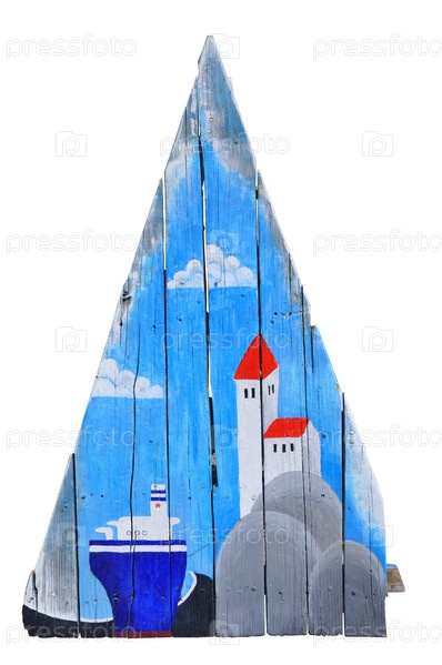 Ветхие деревянные доски с трещинами и картиной с небом, облаками, кораблем и маяком