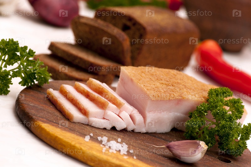 Нарезанное соленое сало с ржаным хлебом, чесноком, перцем и луком