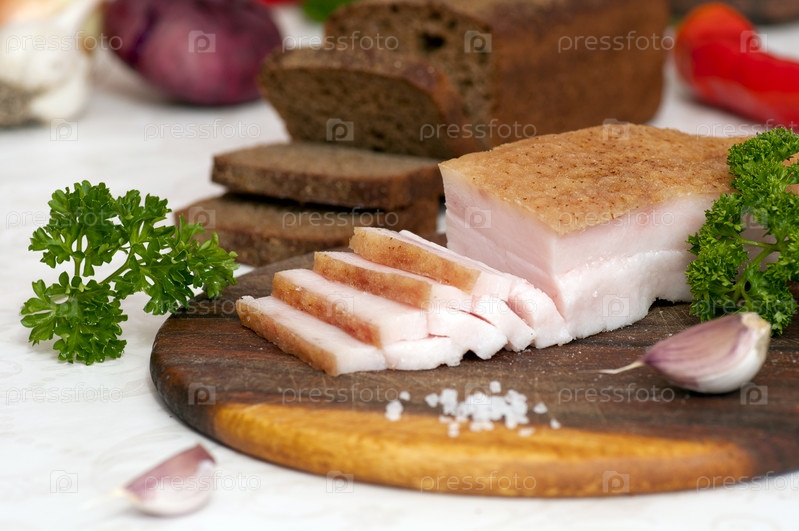 Нарезанное соленое сало с ржаным хлебом, чесноком, перцем и луком