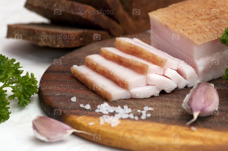 Нарезанное соленое сало с ржаным хлебом, чесноком, перцем и луком