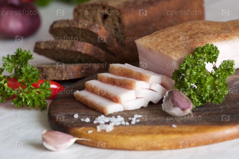 Нарезанное соленое сало с ржаным хлебом, чесноком, перцем и луком