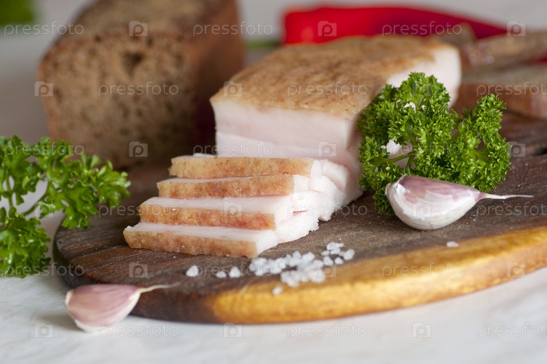 Нарезанное соленое сало с ржаным хлебом, чесноком, перцем и луком