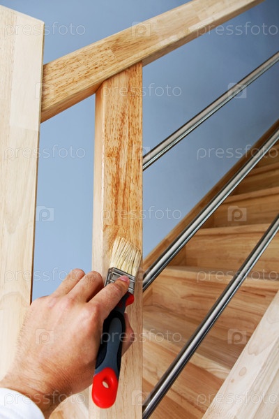Рука наносит лак на деревянную лестницу