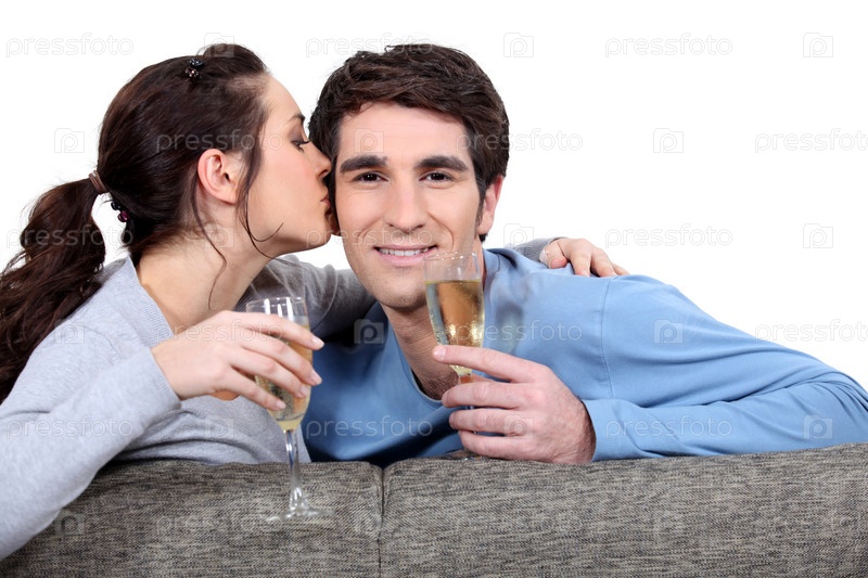 Пара с фужерами целуется