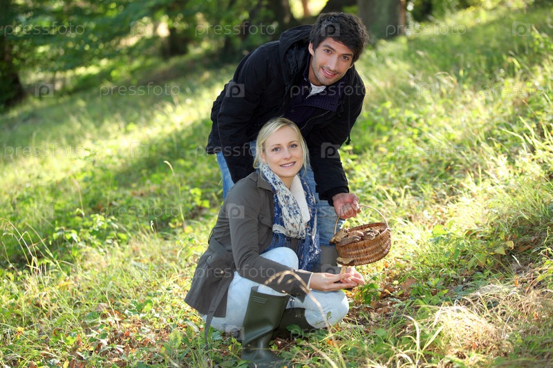 Пара собирает грибы в лесу