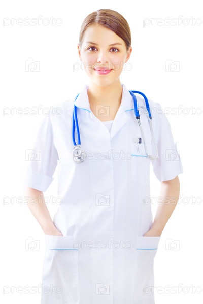 Женщина-врач с милой улыбкой, изолированная на белом фоне