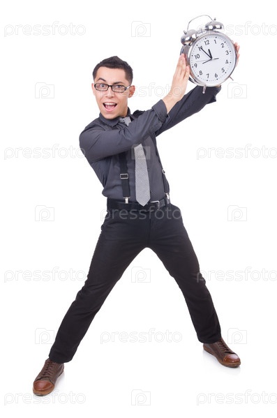 Смешной бизнесмен с часами, изолированный на белом фоне
