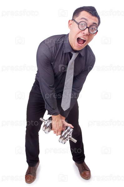 Смешной бизнесмен с гантелями, изолированный на белом фоне