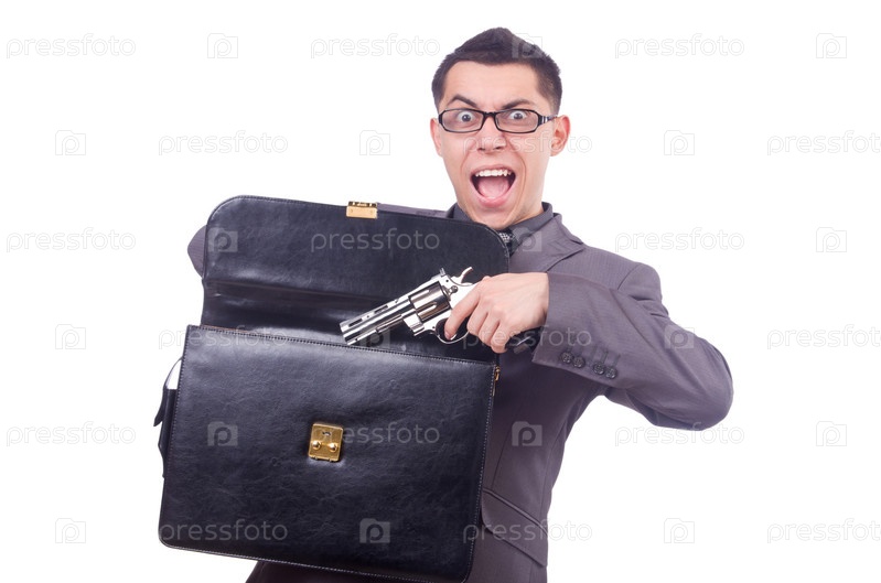 Смешной бизнесмен с пистолетом на белом фоне