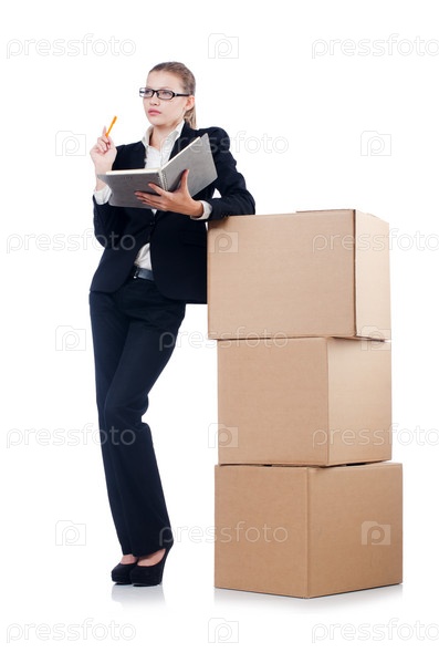 Деловая женщина с коробками на белом фоне