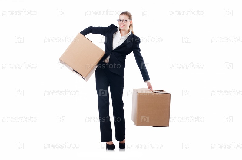 Деловая женщина с коробками на белом фоне