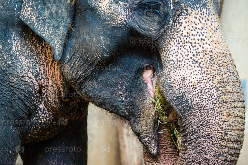 Азиатский слон ест зеленую траву