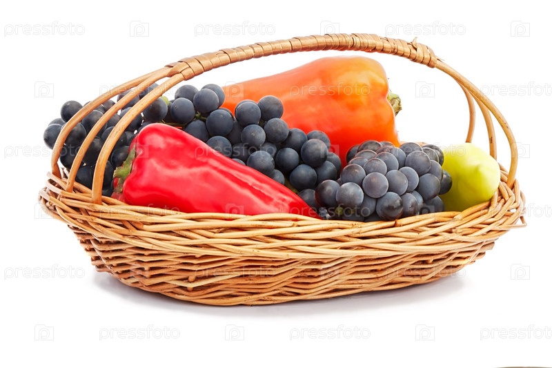 Красный, желтый перец и виноград в плетеной корзине на белом фоне