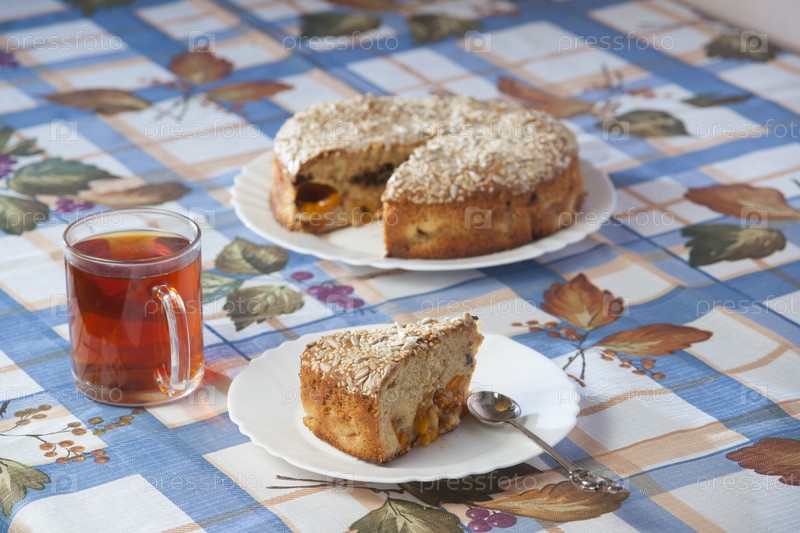 Абрикосовый пирог на тарелке и чашки с чаем