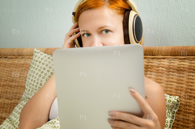 Рыжеволосая женщина в постели слушает музыку