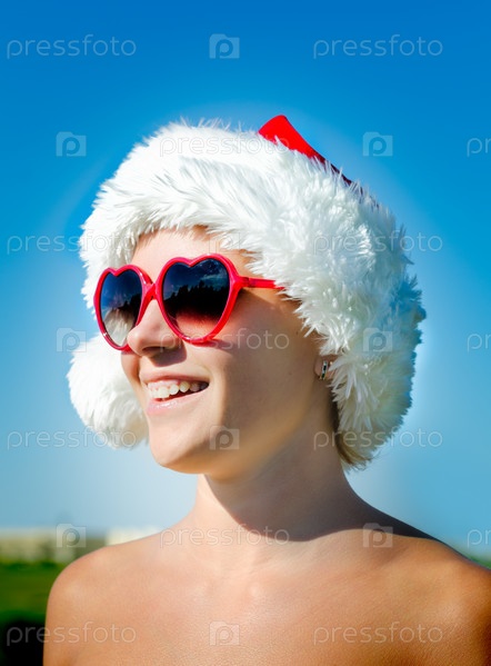 Девушка Санта в солнцезащитных очках в форме сердца