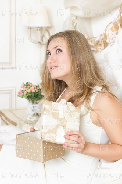 Девушка с подарком на кровати в роскошном интерьере