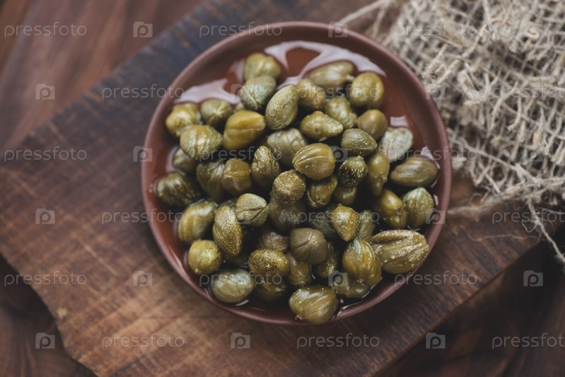 Маринованные каперсы в керамической тарелке, вид сверху