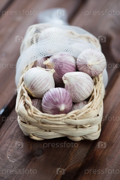 Плетеная корзина с китайским чесноком соло на деревянном фоне
