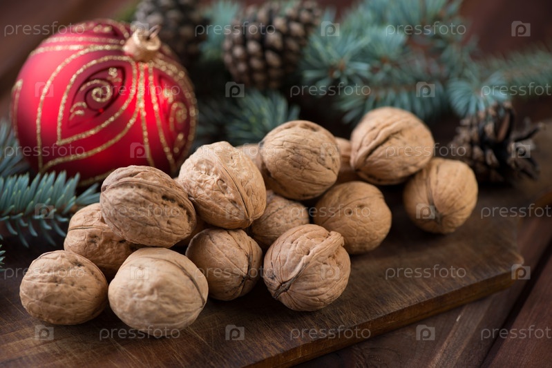 Грецкие орехи, ветви пихты и елочный шар