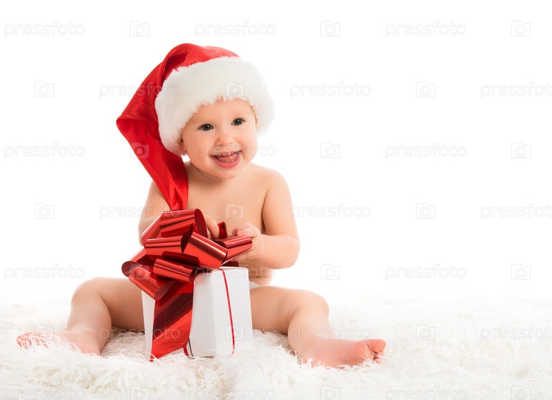 Счастливый малыш в рождественском колпаке с подарком, изолированный