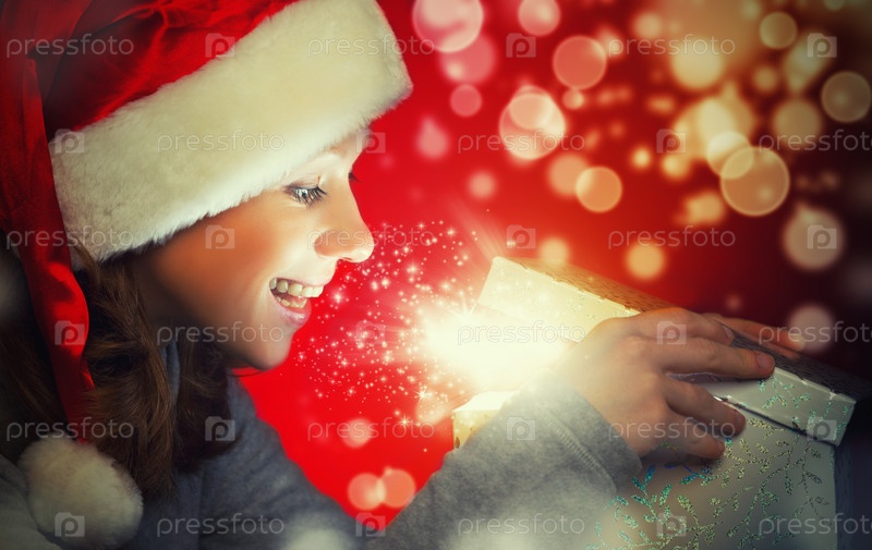 Счастливая женщина в рождественской шапке открывает волшебную коробку