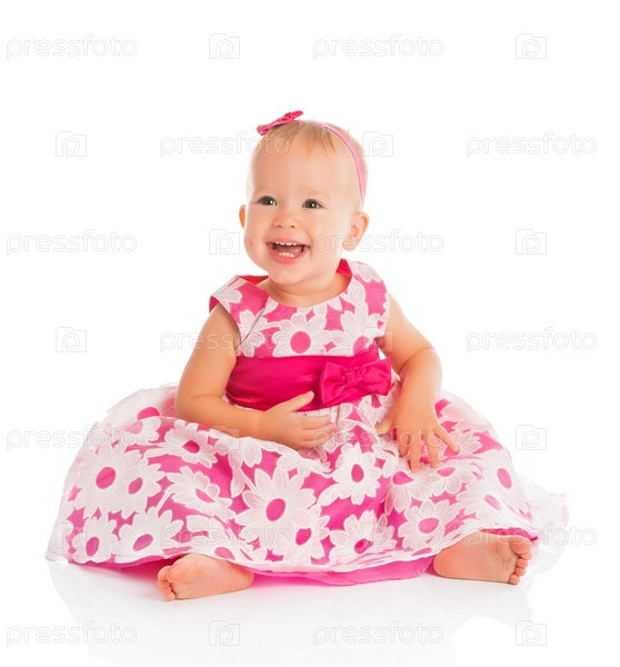 Счастливая маленькая девочка в ярко-розовом платье, изолировано