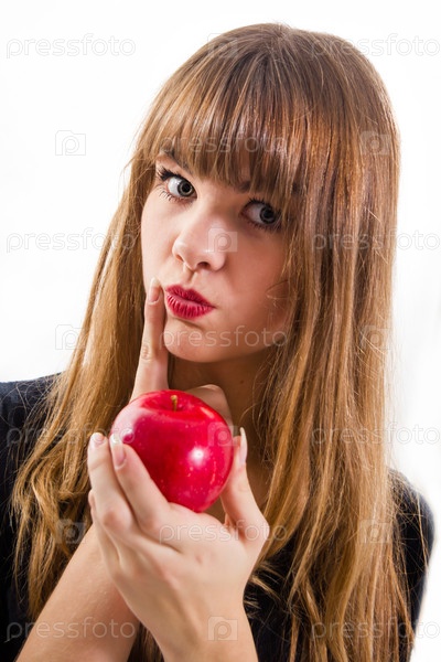 Красивая, молодая девушка и красное яблоко. Изолированные на белом фоне