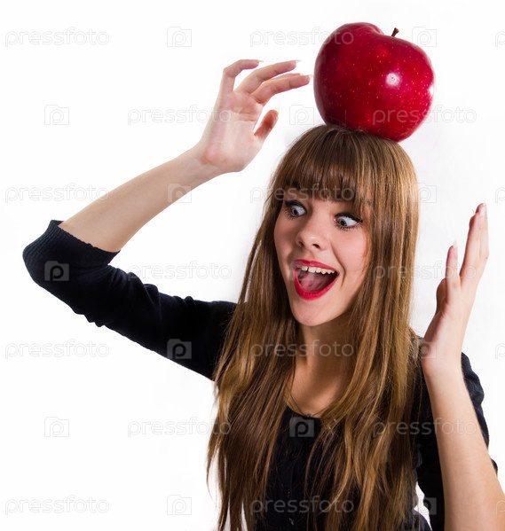 Красивая, молодая девушка и красное яблоко. Изолированные на белом фоне