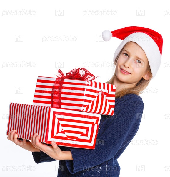 Девочка в шапке Санта-Клауса с подарочной коробкой