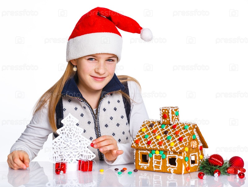 Девочка в шапке Санта-Клауса с пряничным домой