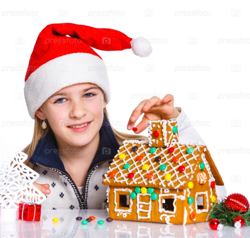 Девочка в шапке Санта-Клауса с пряничным домой