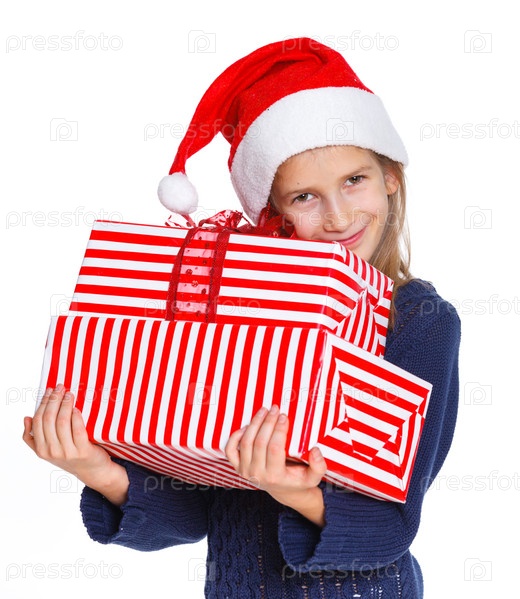Девочка в шапке Санта Клауса с подарками