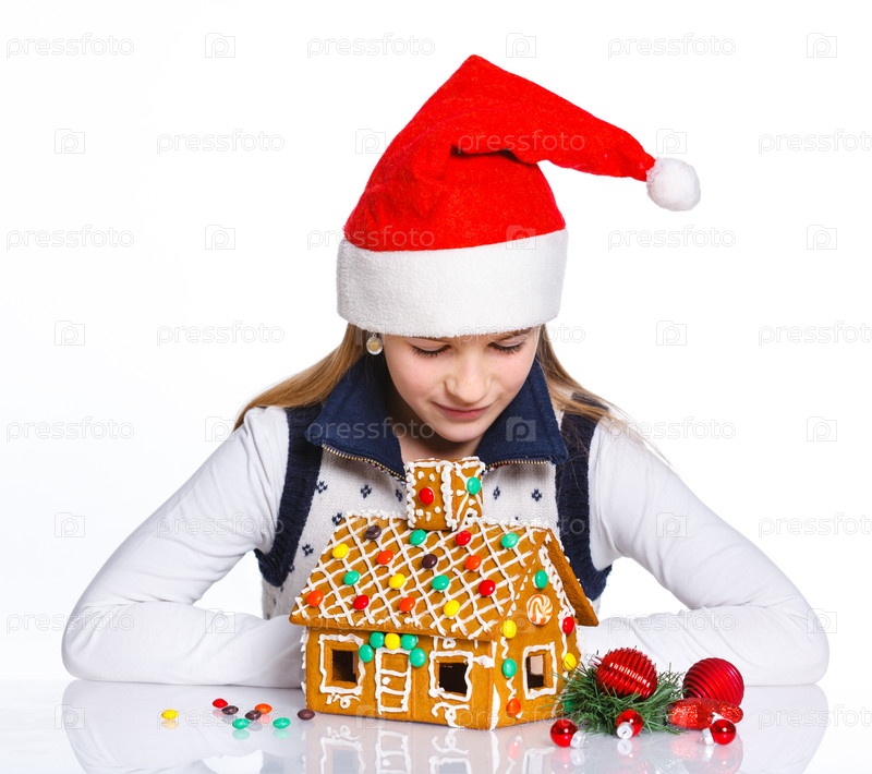 Девочка в шапке Санта-Клауса с пряничным домой