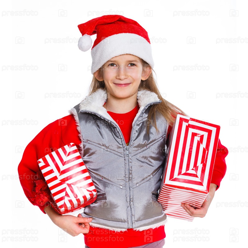 Девочка в шапке Санта Клауса с подарками