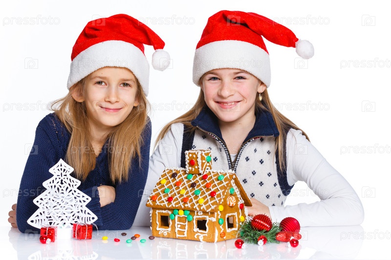 Девочки в шапках Санта-Клауса с пряничным домой