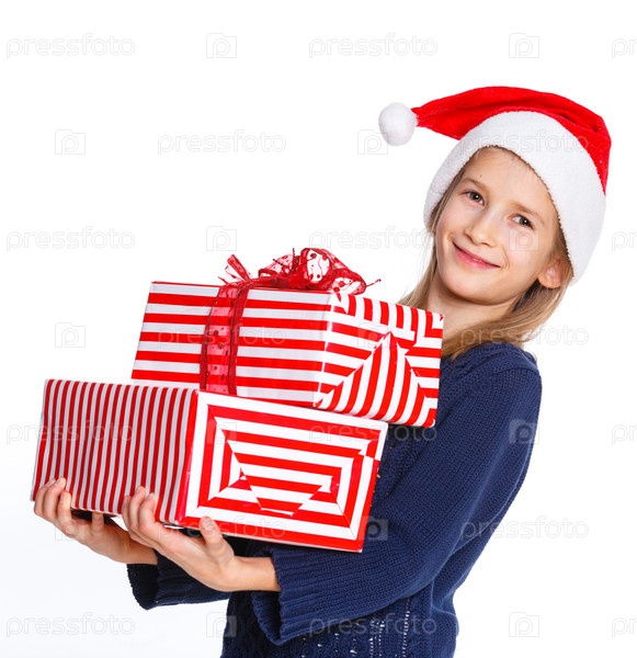 Девочка в шапке Санта-Клауса с подарочной коробкой