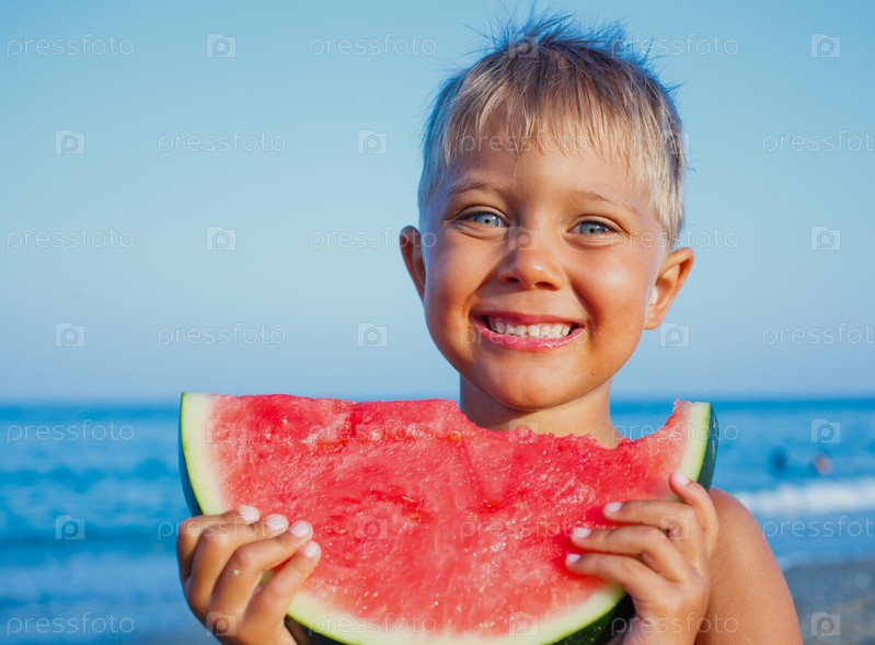 Мальчик ест арбуз