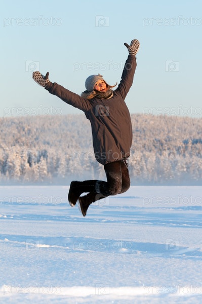 Девушка прыгает на снегу