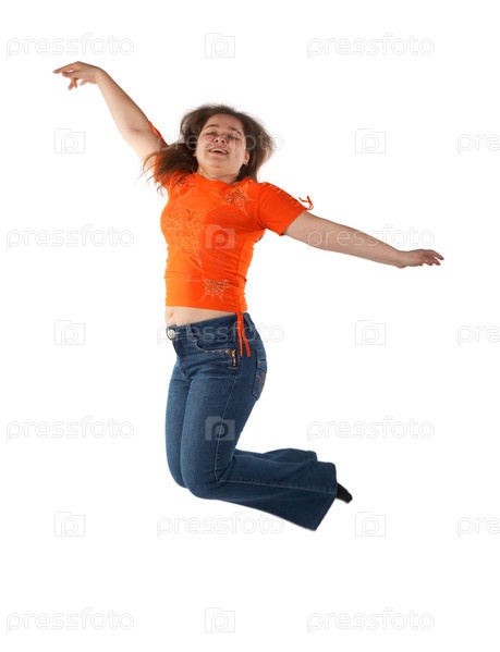 Молодая прыгающая женщина, изолирована на белом