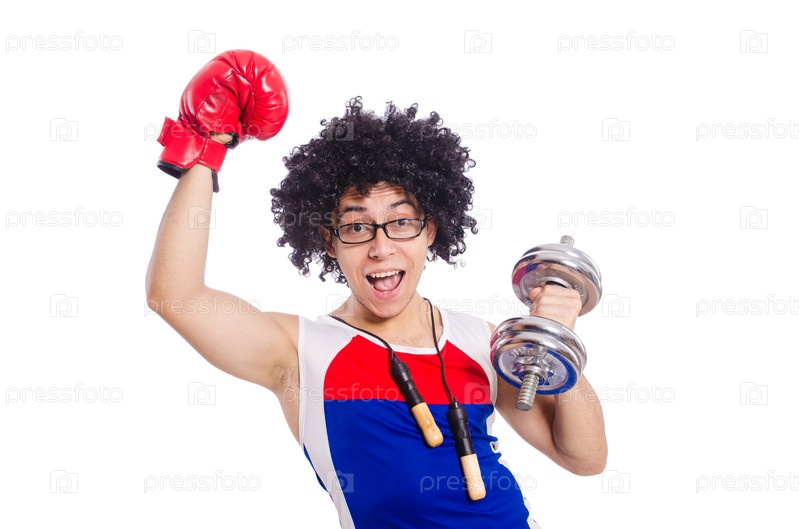 Забавный человек делает упражнения с гантелями