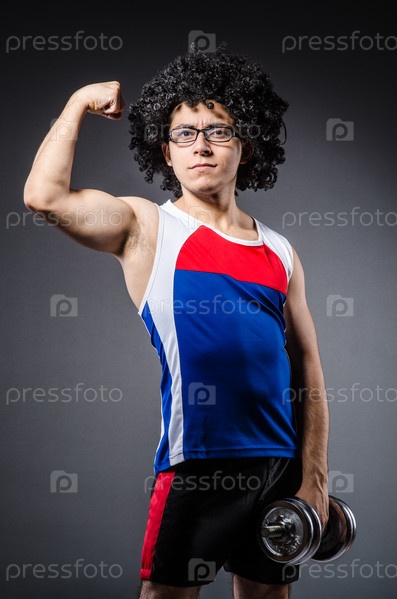 Забавный человек делает упражнения с гантелями