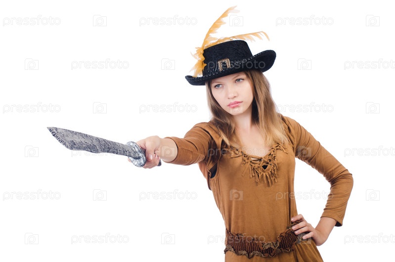 Женщина-пират с ножом, изолированная на белом фоне