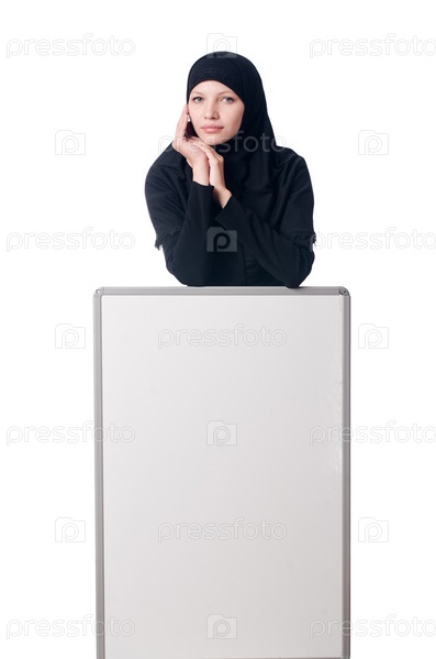 Мусульманская женщина с пустым баннером на белом фоне