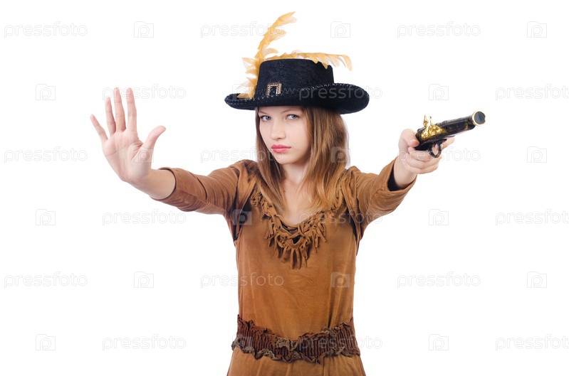 Пженщина-пират с ножом, изолированная на белом фоне