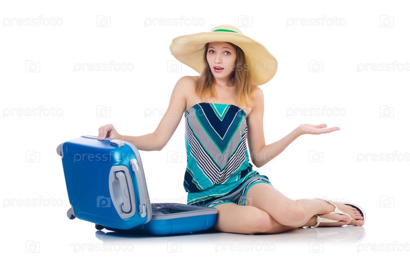 Женщина с чемоданами на белом фоне