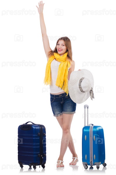Женщина с чемоданами на белом фоне