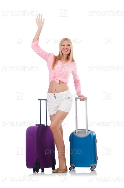 Женщина с чемоданами на белом фоне