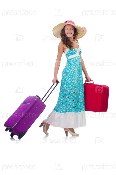 Женщина, готовящаяся к отпуску, с чемоданом на белом фоне
