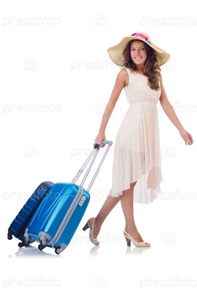 Женщина, готовящаяся к отпуску, с чемоданом на белом фоне